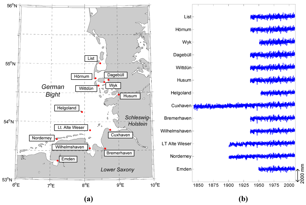 During the last century, coastal regions have been strongly governed by a rapid growth in populations and economic assets with increasing urbanization affecting the vulnerability. At the same time, global sea levels have risen as a result of a warming climate. Over the 20th century a significant rise in global mean sea level (MSL) has been detected by different authors using various techniques []. The results of these studies show a strong variability in the rates of rise that is far from linear with inter-annual fluctuations linked to regional climate patterns []. Furthermore, the rates of observed MSL vary across the globe with regions of increase and regions of decrease []. An extensive study addressing regional sea level development in the German Bight was conducted by Führböter and Jensen []. They analyzed mean tidal high water levels (MHW) and mean tidal low water levels (MLW) over a time span of about 140 years and found significant increasing trends for the MHW of about 2.5 mm/yr on average but no significant change in the MLW. Jensen and Mudersbach [] updated and extended the study (in terms of the considered time period) and affirmed the key findings. They reported an increase in the mean tidal range (MTR) of about 10% since 1955 along the German North Sea coastline. Mean sea level changes in the German Bight have recently been investigated by Wahl et al. [,], based on MSL time series from 13 tide gauges covering the entire German Bight. The focus was on analyzing long-term changes, making use of different statistical techniques. They found two periods of accelerated sea level rise, one at the end of the 19th century and another covering recent decades with some differences along the coastline.