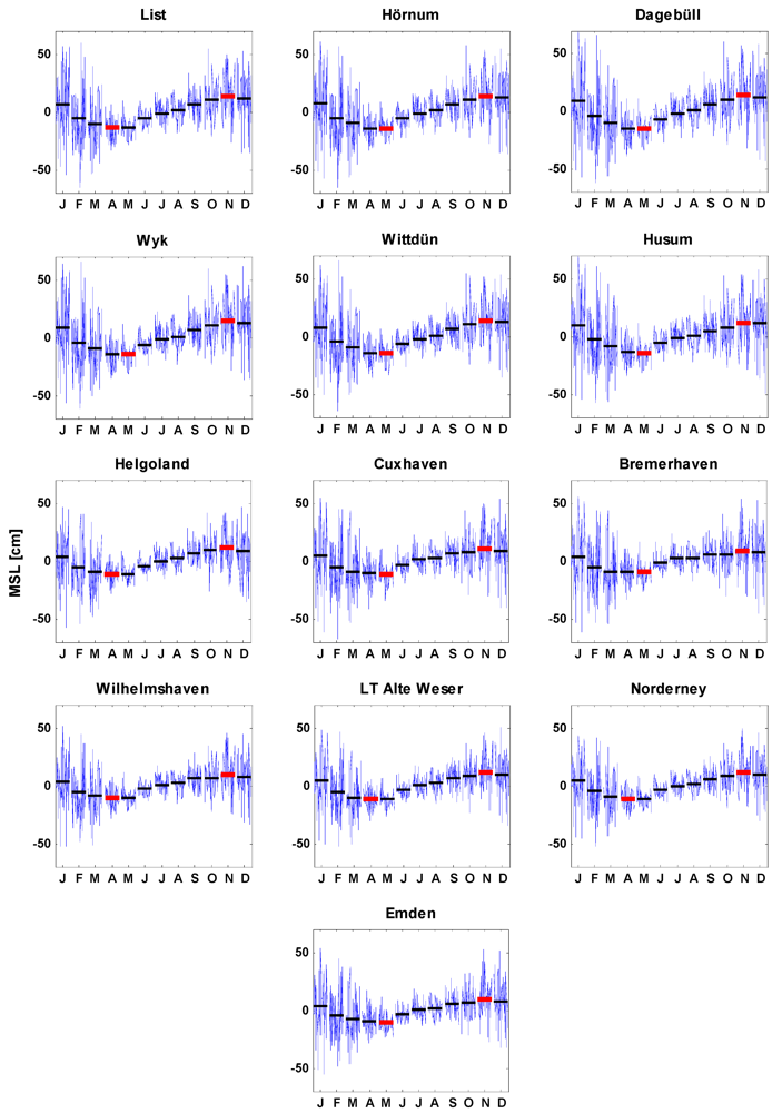 In this section the results from analyzing the seasonal component of the de-trended monthly MSL are presented. The variability of the seasonal cycle is figured by the means of month plots that are shown in Figure 2. The blue lines represent the time series for every single month over the period 1951 to 2008 (i.e., for example, all January values from 1951 to 2008). The horizontal black lines represent the average values for the particular month. The bold red lines show the months with minimum and maximum values of the seasonal cycle. For all tide gauges in the German Bight the maximum is found in November, while the minimum is in April for List, Wilhelmshaven, LT Alte Weser, Helgoland and Norderney and in May for Hörnum, Wyk, Dagebüll, Wittdün, Husum, Cuxhaven, Bremerhaven and Emden. The amplitude of the seasonal cycle is higher along the northeastern coastline (i.e., the state of Schleswig-Holstein) with values from 27–29 cm compared to the southwestern part of the German Bight (i.e., the state of Lower Saxony) with values for the amplitudes of about 20–23 cm. These amplitudes are higher than those computed for the North Atlantic region (e.g., []), but comparable to those for the Baltic Sea reported in [].