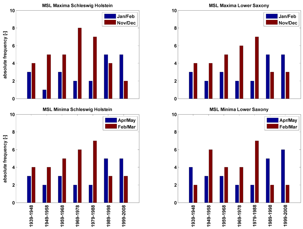 Furthermore, the year-to-year variability of the maximum and minimum values of the seasonal cycle is analyzed. It is calculated how often each month the maximum or minimum monthly intra-annual sea level (absolute frequency) occurs within a decade. Seven different decades, starting with 1939 to 1948 and ending with the decade 1999 to 2008, are evaluated.