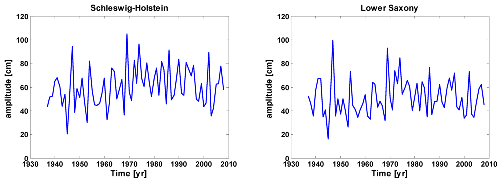 Annual amplitudes of the seasonal cycle are computed as differences between maximum and minimum values for each year. Figure 4 shows the temporal development of the amplitude of the two virtual stations for Schleswig-Holstein and Lower Saxony and for the time period from 1937 to 2008. Both time series show similar temporal behaviors. The correlation coefficient of the amplitudes of both areas is found to be r = 0.93, whereas the amplitude of the annual cycle for Schleswig-Holstein is characterized by a slightly higher variability (and a higher mean value as already mentioned in Section 4.1) compared to Lower Saxony. Note that the annual amplitudes computed by this method are considerably higher than those mentioned in Section 4.1, where average values were considered to calculate mean amplitudes (in the order of 20 to 25 cm). Here, annual amplitudes are determined and found to be of the order of 50 to 60 cm. This is caused by the high temporal variability in the German Bight, which is described in section 4.1. However, as can be seen from Figure 4, the annual amplitudes for both virtual station time series do not show significant linear trends.