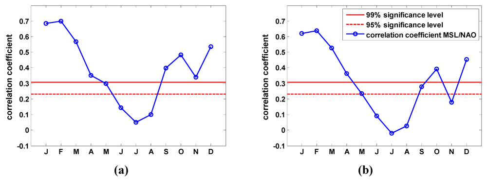 To evaluate the relationship between inter-annual MSL variability and regional climate patterns, the monthly MSL time series of the virtual stations of Schleswig-Holstein, Lower Saxony and the entire German Bight are compared to the NAO index. In a first step, the MSL time series for each month are correlated with the analogical NAO time series. The significance of the correlation coefficients rxy is tested with a t-test as described by von Storch and Zwiers [].