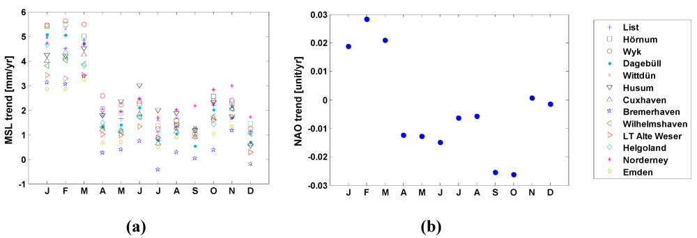 The relationship between the de-trended MSL, represented by the two virtual stations for Schleswig-Holstein and Lower Saxony, and the de-trended NAO is shown in Figure 5. The blue line represents the correlation coefficients for the individual months and the period from 1937 to 2008. The red lines indicate the 95% and 99%-significance levels (based on t-test statistics (e.g., [])). There is a strong annual cycle in the correlation, with significant correlations in the winter season and weak or no correlations in the summer months. For the whole year, correlation coefficients for time series from Schleswig-Holstein and the NAO are slightly higher than the coefficients for MSL time series from Lower Saxony and the NAO. This gradient between Schleswig-Holstein and Lower Saxony has also been found in the variability of the seasonal cycle in Sections 4.1 and 4.2. The highest correlations are found from January to March. This leads to the assumption that the highest influence of NAO on long‑term development of MSL should also be found in these three months. While for the correlation analysis only de-trended time series are investigated, it is of particular importance in which manner the NAO may influence linear trends of MSL. To consider this, linear trends of MSL time series for each month are compared with those found from corresponding monthly NAO time series. The linear trends of monthly time series for both parameters are pictured in Figure 6. At the top of the figure the different dots indicate the trends of monthly MSL time series for the individual sites and the period from 1951 to 2008. Figure 6 (bottom) shows the monthly trends of the NAO. Both parameters show similar behavior for the winter months, indicating significantly higher trends from January to March compared to the remaining months (i.e., significantly different on the 1σ-significance level). Although correlation over the whole year is not constant between the two parameters and partially weak (especially in the summer months), a similar trend pattern is notable from Figure 6. This behavior was also found for the other two time periods (i.e., 1937–2008 and 1971–2008), which are not pictured here.