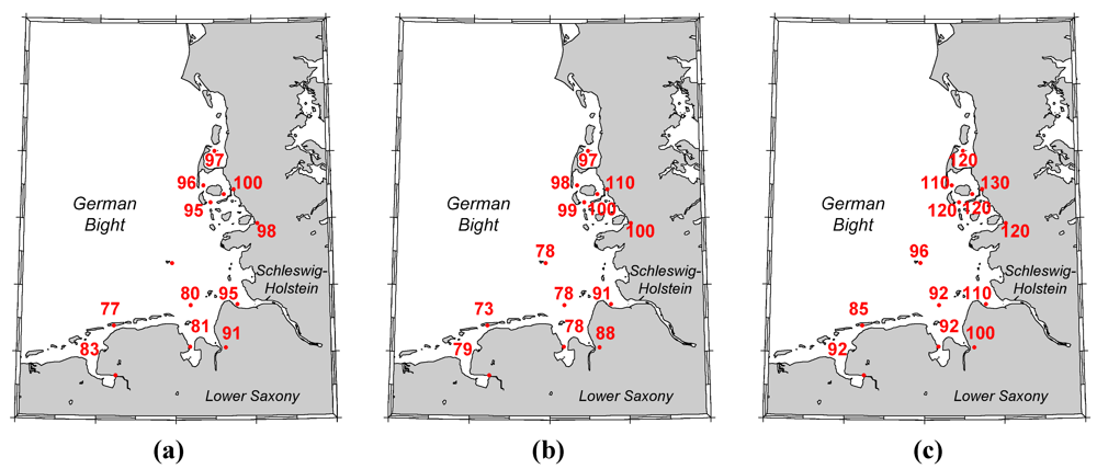 As outlined by Wahl et al. [], from analyzing annual MSL time series, higher trends are found for tide gauges along the coastline of Schleswig-Holstein compared to Lower Saxony.