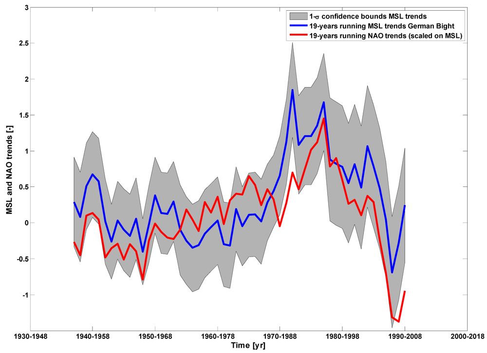 19-year running linear trends of swMSL (blue line) at the virtual station German Bight and swNAO (red line) for the period from 1937 to 2008. The grey-filled area indicates the 1 − σ confidence bounds for the linear trends estimated by linear regression.