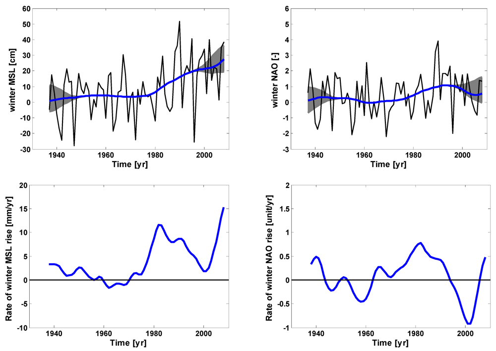 Time series of swMSL and swNAO for the German Bight (black lines, top) and LOWESS smoothing (blue lines, top). The grey-filled areas indicate the results of the MCAP method. The annual rates of rise calculated as the first differences of the smoothed time series are shown in the plots at the bottom.