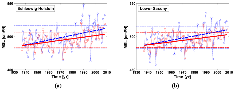 We also analyze the influence of swNAO on long-term swMSL changes. The results, given in Table 2, indicate that the swNAO influences swMSL, in two different ways. On the one hand, the swNAO influence explains 30–35% of the inter-annual swMSL variability in the German Bight. These findings are in agreement with the results presented by Jevrejeva et al. [] for the North and Baltic Sea, even if the inverse barometric effect has not been considered for the present study. On the other hand, the swNAO also influences the long-term swMSL trends in the German Bight. For all of the three time periods under consideration, the NAO influence leads to higher trends from January to March. For the first two time spans (i.e., 1937 to 2008 and 1951 to 2008) the swNAO explains up to 47% (2.3 mm/yr) of the estimated swMSL trends. For the period from 1971 to 2008, the swNAO influence is considerably smaller and explains about 18% (1.3 mm/yr) of the estimated swMSL trend. This is caused by a smaller trend in the swNAO for the latter time period compared to the longer periods considered in the present study. This highlights that the influence of the swNAO on long-term swMSL trends depends on the time period under consideration. This is also confirmed from analyzing 19-year running linear trends and the non-linear behavior for the time period from 1937 to 2008. The main influences of the swNAO on swMSL in the German Bight are summarized in Figure 10. The swMSL estimations for Schleswig-Holstein (Figure 10a) and Lower Saxony (Figure 10b) are shown before (blue line) and after, removing the swNAO influence (red line) (only the long time period from 1937–2008 is considered). The standard deviations are represented by the dotted lines and the long-term trends are highlighted as bold lines. For both virtual stations it can be stated that a correction of the swMSL estimations for the swNAO influence causes a reduction of variability and trends.