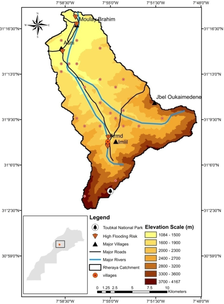 The High-Atlas Mountains are mainly composed of metamorphic and eruptive formations, which are impervious and generate overland flow. Some pervious zones are still present, due to calcareous and marly sandstone formations or local weathering of the impervious formations. These pervious zones are probably responsible for additional delay in lateral subsurface flow. The relief of the Atlas Mountains is very sharp with steep slopes [19].