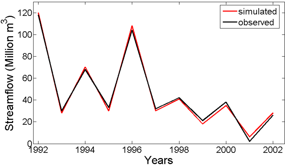 The watershed model was calibrated with streamflow data from the ORMVAH. Calibration is performed by comparing observed and modeled inflows to Rheraya watershed.