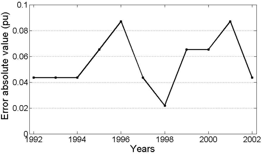 This result is also verified by Figure 4, which shows the absolute value of the calculated error between observed and simulation results. It can be seen from the figure that the error is small, remaining under 8 × 10−2(pu), per unit (pu) is equivalent to normalizing the quantities used; thus, confirming the pertinence of the Rheraya catchment WEAP model.