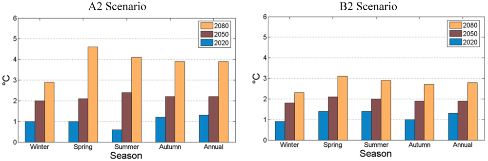 Seasonal and annual anomalies (°C) of mean temperature for the three future horizons 2020, 2050 and 2080 and for both A2 and B2 scenarios at Rheraya catchment.