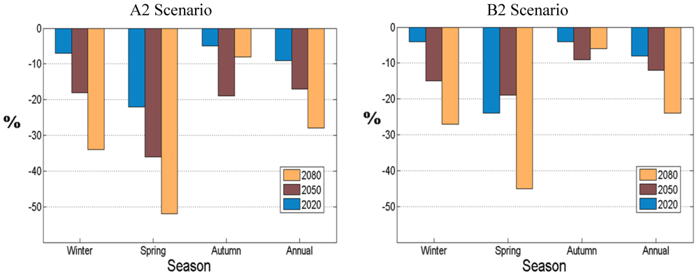 Percentage change in the level of cumulative seasonal (winter, spring and autumn) and annual rainfall for the three future horizons 2020, 2050 and 2080 and for both A2 and B2 scenarios at Rheraya catchment.