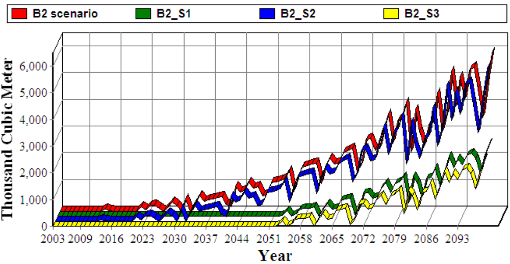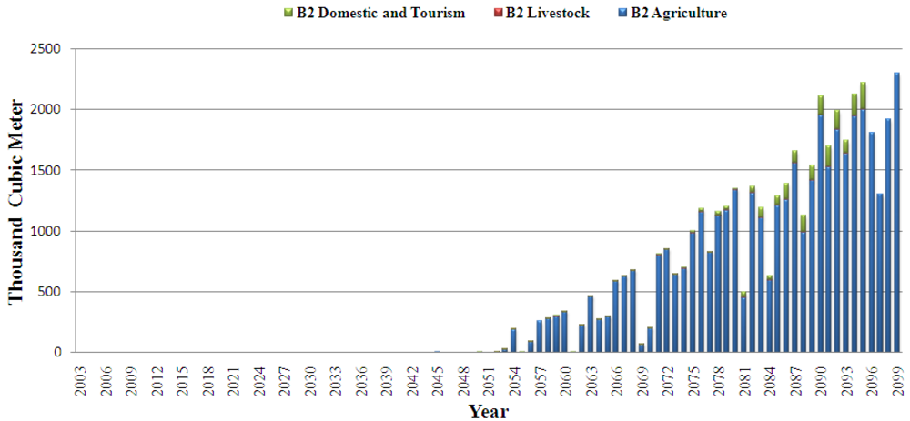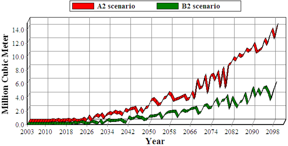 Both scenarios showed an increasing trend in water demand over time. A2 scenario exhibits a more pronounced increase than B2 scenario. Simulation results shown in Figure 7 demonstrate that the average annual unmet demand (quantity of water that cannot be physically delivered to the demand site) will dramatically increase over 70% and 90% of the total annual demand, respectively for B2 and A2 scenarios.