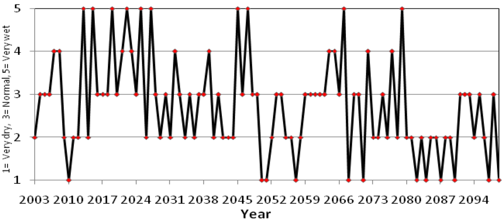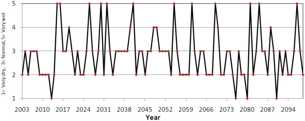 Sequence of wet and dry years for B2 scenario.Water year type: 1 = Very Dry, 2 = Dry, 3 = Normal, 4 = Wet, 5 = very Wet.