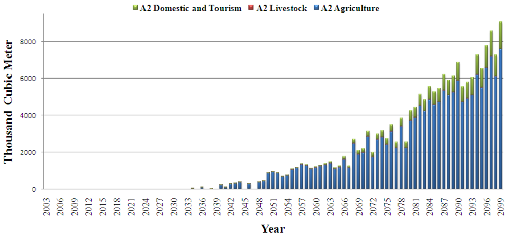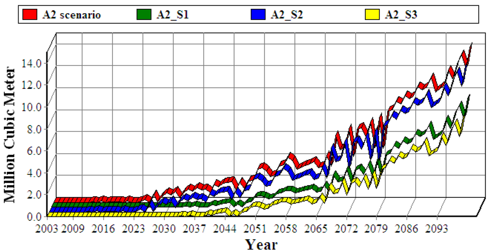 In scenario A2, the water demand for agriculture would continue to increase whereas which the adoption of adaptation strategy (S1) could partly offset (Figure 11). As it can be seen in Figure 12, the offset in water demand was greatest in B2 scenario. The differences in forecasted temperatures and precipitations between the two scenarios explain the greater capacity of improvements in irrigation efficiency to offset water demands in B2 scenario.
