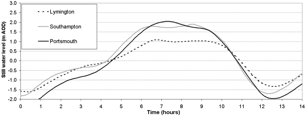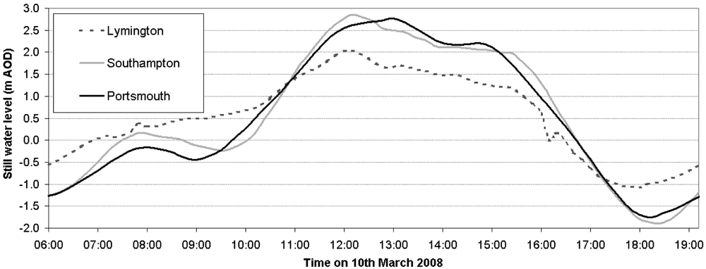 Water level time-series; recorded at three locations across the Solent (refer to Figure 1) during a typical spring tide.