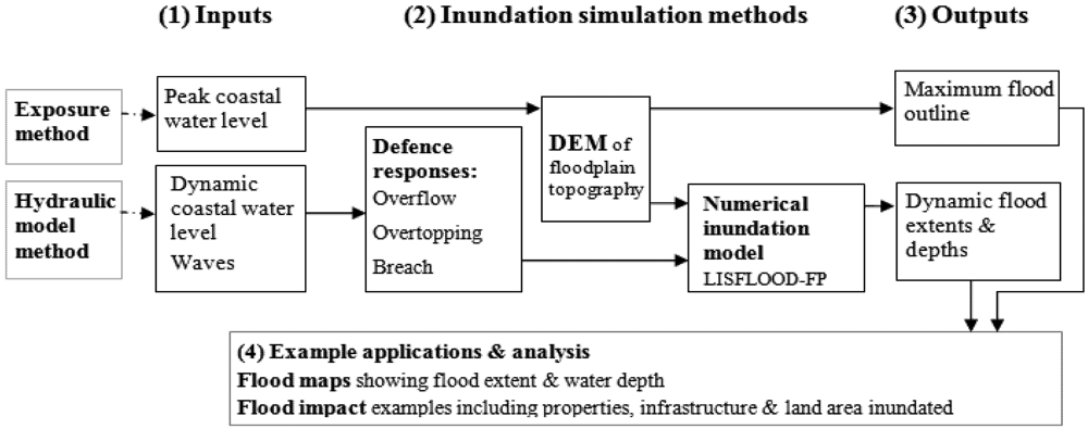Method and model overview showing (1) inputs; (2) inundation simulation approaches; (3) outputs; and (4) example applications.