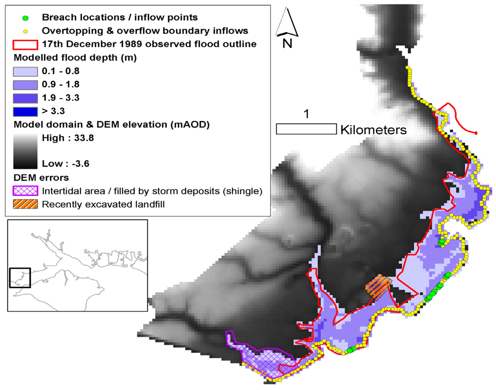 A model is said to be validated if its accuracy and predictive capability in the validation period have been proven to lie within acceptable limits or errors for a particular purpose [68]. However, for many coastal areas information to validate inundation models is not available. Flood simulations were compared with observations gained from two actual floods: (1) a regional event on 10th March 2008, which comprised widespread although mostly minor flooding across the Solent; and (2) an event in December 1989 where inundation resulted from overtopping and sea wall breaching between Hurst Spit and Lymington.