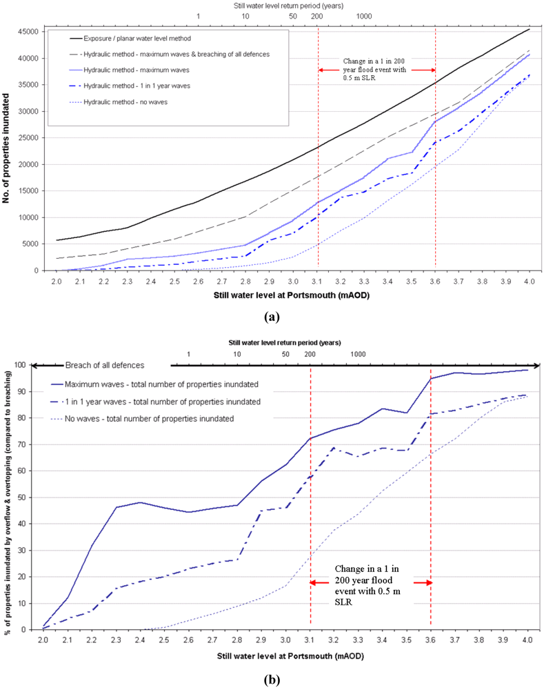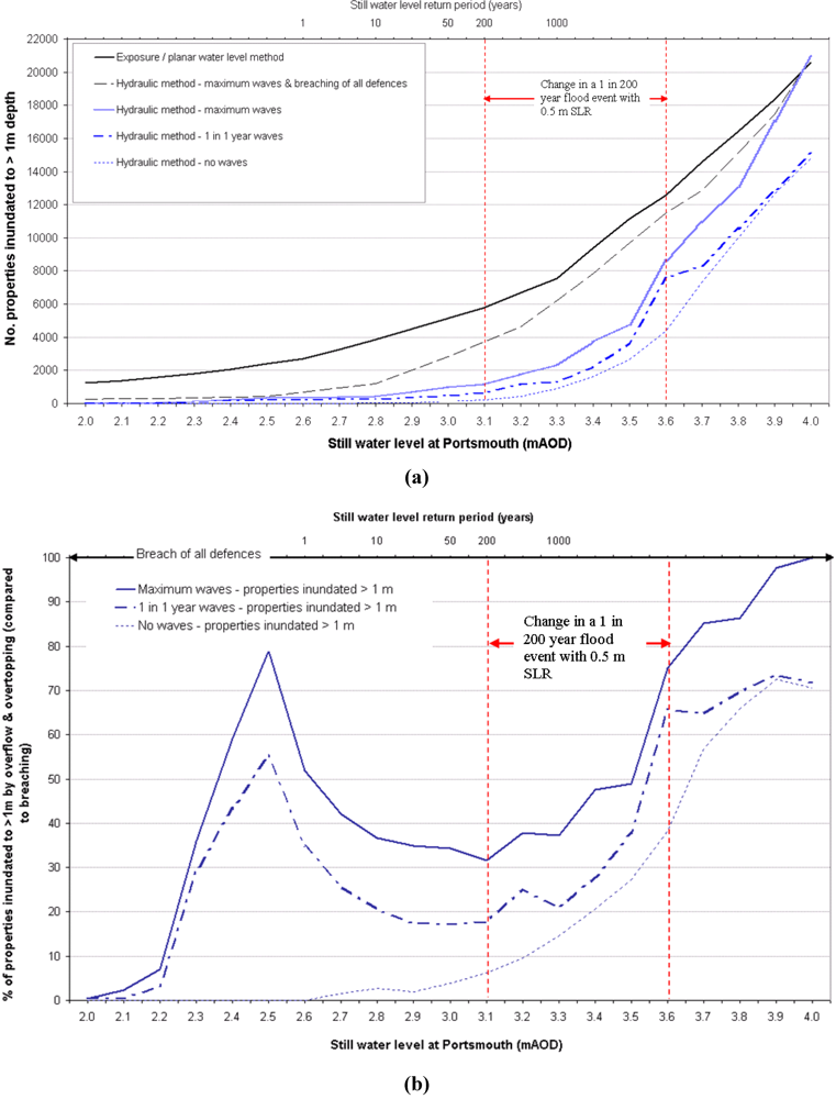 Table 4 summarises the results of a 1 in 200 year water level flood. As expected e.g., [9], hydraulic modelling (even with extreme wave overtopping and breach scenarios) estimated less flooding than calculated by the planar water level method. The flood simulation using an annual wave extreme suggests that more than 10,000 properties could be impacted by this water level event. The model validation case studies indicated that waters exceeding 1 m depth could be a more useful indicator of the number of buildings that experience flooded interiors. This criterion suggests that for the synthetically modelled floods, increasing wave loadings from the annual to maximum extreme (and with no breaching) almost doubles the number of properties that would be significantly inundated. Inclusion of breaching (of all the region’s defences) in the hydraulic flood simulation method almost trebles the effects from waves alone (for the count of properties inundated to greater than 1 m depth).