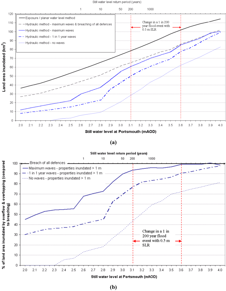 Performance measures verified that the main components of the model (DEM, defence data, etc) are sufficiently accurate for modelling hypothetical coastal flood events. This section firstly focuses upon simulation of a 1 in 200 year regional coastal still water level flood (indicative of the standard of protection for urban coastal defences in England and Wales and definition of Environment Agency flood zone maps). Secondly, inundation across a range of coastal flood simulations is described. This indicates model sensitivity and uncertainty related to boundary water levels, and provides a regional overview of potential flood event impacts at present and higher sea levels. In this paper, the inundation simulations driven by defence failures are in a deterministic form, rather than comprising a sampling-based flood system analysis e.g., [26]. Inundation scenarios modelled for each still water level include: (a) the planar water level flood outline; (b) a worst-case hydraulically modelled flood that includes breach of all defences; and (c) three categories of wave loading simulated with the hydraulic model although without breaching (these include no waves, an annual extreme, and the maximum possible wave conditions) hence accounting for overflow, overtopping and outflanking failures only (for one tidal cycle). The still water levels (and definition of flood event extremity) applied to the model boundaries were based upon the extreme water level analysis described in section 3.1 and Figure 5. The water level time-series applied to the inflow points simply comprised shifting storm-tide curves (Figure 3) to the relevant peak still water level.