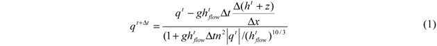 where q is the flow per unit width, hflow is the depth of water available to flow, ∆t is the model time step, ∆x is the model grid resolution, z is the bed elevation, h is the water depth, and n is the Manning’s friction coefficient. Water depths are updated using Equation (2):