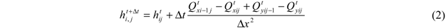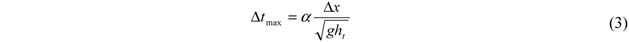 where Q is the discharge, hij is the depth of water in the cell (i,j). The stability criterion for this numerical model is given by the Courant–Freidrichs–Levy condition for shallow water flows such that the stable model time step, ∆t, is a function of the grid resolution, ∆x, and the maximum water depth, h, within the domain: