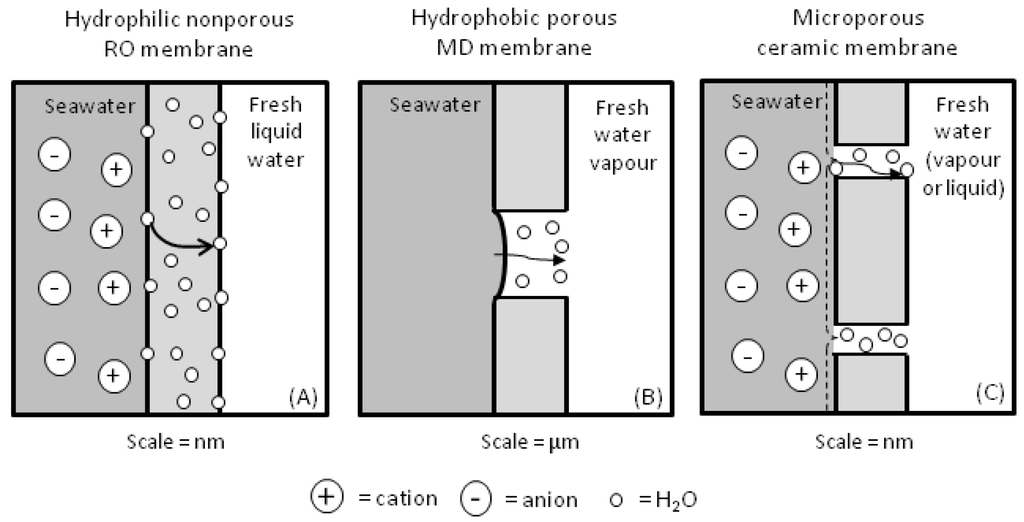 Water desalination is a process in which fresh water is extracted from aqueous solutions such as seawater, brackish water and brine, which contain dissolved salts and other minerals. For water molecules to diffuse through a membrane, a driving force must be established, otherwise water molecules will remain mixed in the aqueous salt solution. The driving force is associated with concentration, pressure and temperature difference between the feed and permeate sides of the membrane. In the case of RO processes, the water molecules must overcome the osmotic pressure to diffuse through dense polymeric membranes. As the osmotic pressure of typical saline solutions ranges from 0.2 MPa to 3 MPa for brackish water to seawater respectively, RO desalination processes are generally pressure intensive with pressures of between 6 MPa and 8 MPa commonly used for seawater applications [4]. In contrast, MD does not attempt to overcome the osmotic pressure and so does not require a pressurised feed, although being a thermal process the water flux is proportional to the vapour pressure difference across the membrane. MD generally uses porous hydrophobic membranes, where pore size ranges between 1 µm and 100 Å, and the water vapour permeating via the pores is subsequently condensed downstream to produce fresh water [17]. MD operates at lower temperatures (up to 70 °C) when compared to conventional thermal process such as multi-stage flash or multi-effect distillation. Finally, the PV process, when applied to desalination, employs molecular-sieving (dp = 3–5 Å) ceramic membranes with a narrow pore distribution smaller than the diameter of the hydrated salt ions (>6 Å). Therefore they have the potential to completely reject salt ions while permitting water molecules to permeate. MD and PV are similar processes that can be chiefly identified by the way in which the membrane functions. If the membrane is simply a support structure that allows a meniscus to form on the feed side and plays no role in separation then the process is MD. If however, the membrane actively participates in the separation process then the process is PV. To further provide clarity between these three membrane processes, Figure 1 shows a diagram as comparison of RO, MD and PV in desalination processes.