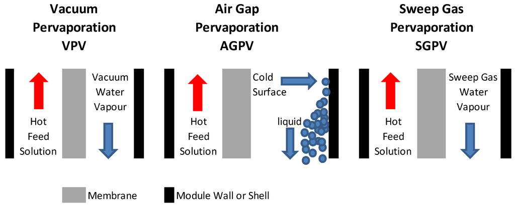 Similar to MD, PV can operate in several different arrangements. The most common MD operational arrangements have been well reviewed elsewhere [17]. The most common PV arrangements are shown in Figure 2 to provide context and include: (i) vacuum; (ii) air gap and (iii) sweep flow. PV can operate using any setup that allows a vapour pressure gradient to form but does not allow the permeate to flow back into the feed.