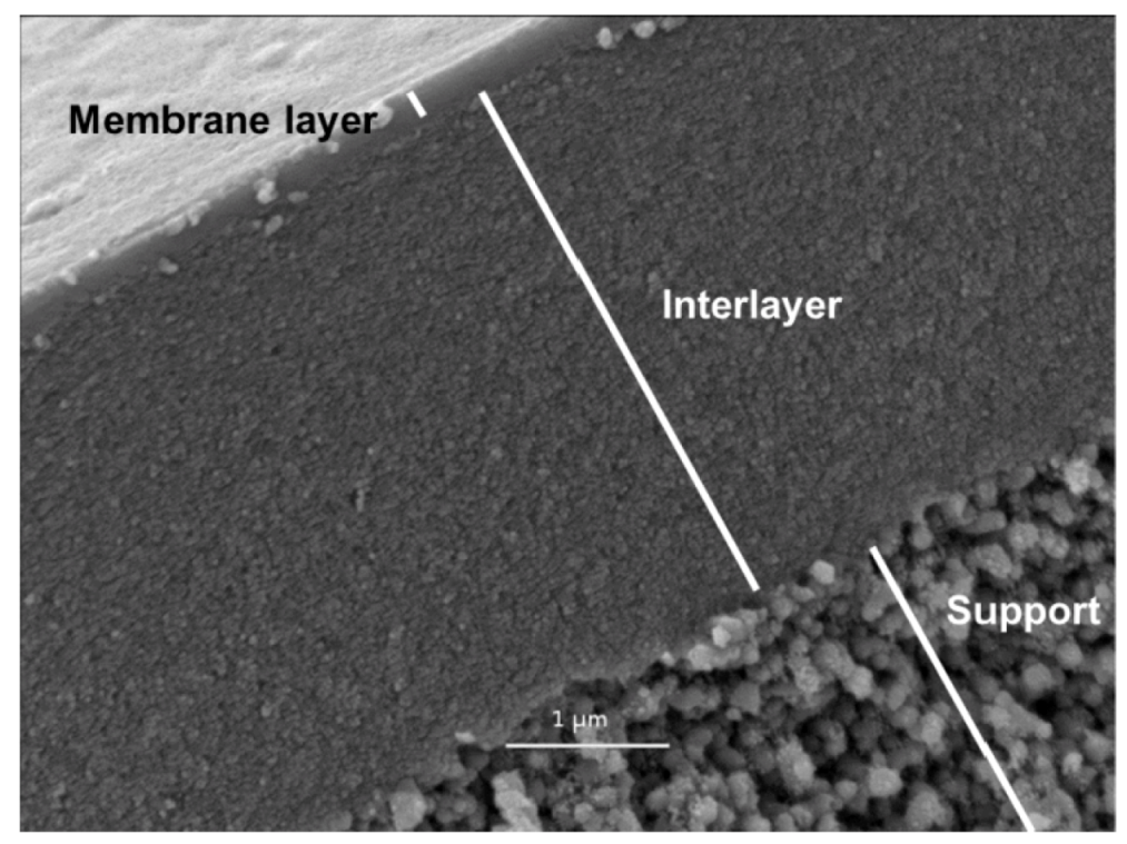 Silica membranes are ultra-thin films (~250 nm) that are traditionally prepared on top of a support for mechanical strength to form an asymmetric structure (as depicted in Figure 3). The support quality plays a major role in the final morphology of the silica derived films as its homogeneity is fundamental in preparing thin films without defects. To achieve this aim, the substrate must have (i) small pore sizes, (ii) low surface roughness and (iii) low defect or void concentration [43]. Substrates with large pores, voids and rough surfaces tend to induce mechanical stress in the films resulting in micro-cracks or pin-hole defects. In order to overcome support roughness, interlayers with smaller pores sizes are typically employed. According to the literature, only a few combinations of support and interlayers have been explored for silica-based membranes for PV desalination. Indeed, supports prepared from α-Al2O3 powders are currently the substrates of choice due to their high porosity and relatively low cost and high mechanical stability. Mesoporous γ-Al2O3, consisting of much smaller pore sizes of ~4 nm are as used in 2 μm thick intermediate layers, and are able to minimize the defect rate observed [44]. However, γ-Al2O3 exhibits low hydrothermal stability [45], which is of concern if these materials are to be used in applications containing water vapour. Alternate intermediate layers include silica-zirconia composites developed by Tsuru and co-workers [46,47], which are typically more hydro-stable than γ-Al2O3 layers.