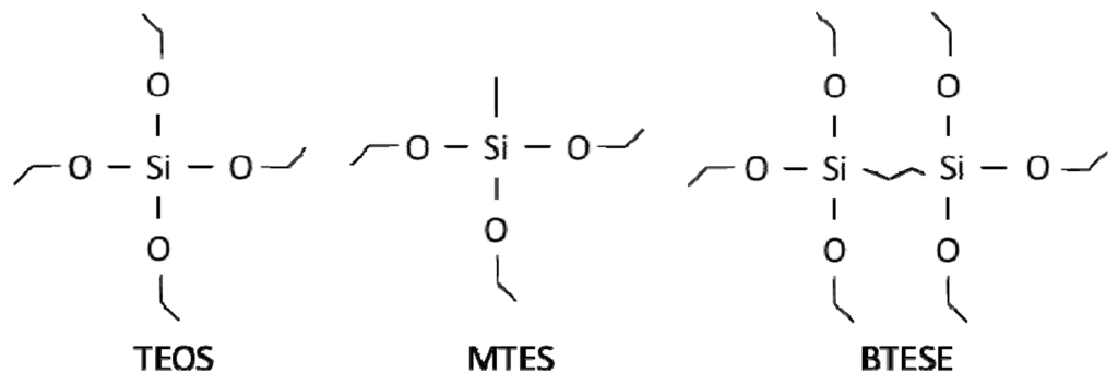Precursors used for the preparation of pure (TEOS), methylated (MTES) and hybrids (BTESE) silica membranes.