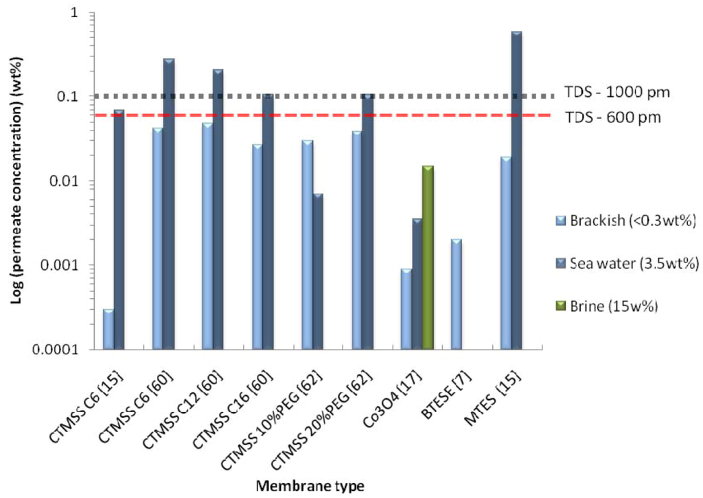 The purity of the water in the permeate stream is a fundamental parameter in terms of potable water. As the salt rejection is generally a ratio of salinities (Equation (2)), a high salt rejection for a high feed salt stream does not necessarily translating into potable water. According to the World Health Organization portable water should have a factor called total dissolved solids (TDS) < 600 ppm with an upper limit of TDS < 1000 ppm [1]. To assess the performance of the membranes in Table 1 in terms of water quality, the permeate water concentration was calculated as shown in Figure 6. All the membranes listed in Table 1 produce good quality drinking water (TDS < 600 ppm) for slightly saline water conditions (0.3 wt %). However, only the CoOxSi silica base membranes were able to meet the requirement of 600 ppm for seawater and brine feed conditions. For those membranes with TDS in excess of 600 or 1000, a second pass becomes necessary to achieve potable water requirements. As discussed previously the theory of PV operation necessitates that the permeate stream should be free of salt, regardless of the feed conditions.