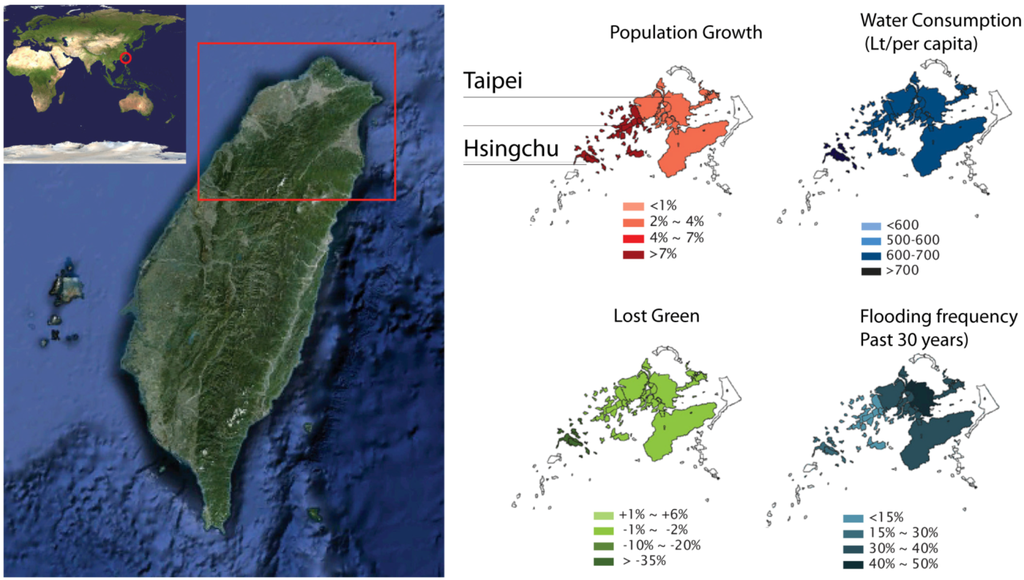 The coastal city of Hsingchu in Taiwan is located approximately 100 km south of the capital of Taipei (24°49' N 120°59' E). The lowest part of the hilly territory is located approximately 34 m above sea level. Figure 3 illustrates the location of Hsingchu, showing population growth, total water consumption, lost green areas, and flooding frequency in comparison with the metropolitan region of Taipei. The majority of urbanized land is located in the drainage zones of the natural river, Dotzpu. The city is affected by both seasonal flooding risks and water shortages due to its high freshwater demand and periodically limited freshwater availability. Water consumption must be temporarily rationed during periods of drought. The freshwater demand of the Hsingchu metropolitan region is supplied by large-scale surface water reservoirs (dams) which are located upstream of the river Dotzpu. Rainwater is generally drained as fast as possible from urban and agricultural areas (to be discharged into the river Dotzpu and finally into the sea) to avoid flooding and related damage to urban infrastructures. The flooding-related problems are severe due to the specific climate and hilly geomorphology [31].