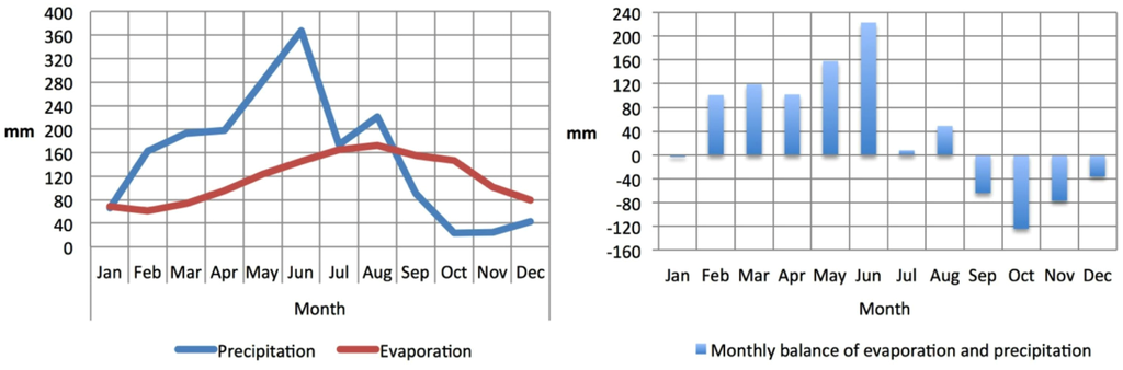 Average monthly precipitation and evaporation rates (left) and balance of evaporation and precipitation (right) for Hsingchu.