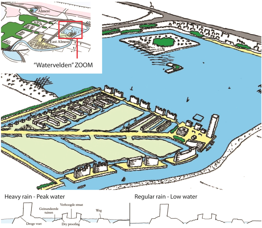 Bird’s eye view (from northeast to southwest) of East Almere city center watervelden. Peak storage fluctuating water level is illustrated for the situation with high water level after heavy rain (bottom left) and the regular situation with low water (bottom right).