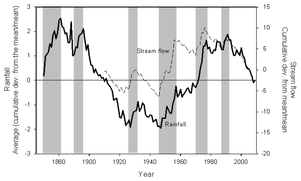 Normalized cumulative deviations from the long-term mean annual rainfall for South East Queensland (SEQ) between 1870 and 2009, and average discharge across three river gauging stations with long-term data: Wide Bay Creek (1910–2005), Munna Creek (1928–2005) and Albert River (1910–2005) (modified from [7]). Vertical shaded bands show extended wet periods of above average rainfall and stream flow.