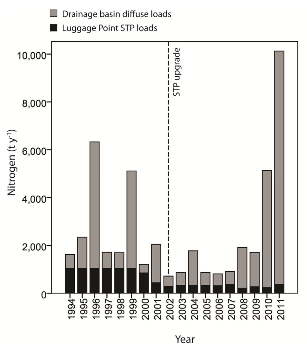 Brisbane River nitrogen loads (t y−1) from the major sewage treatment plants (STP) (Luggage Point) in the region, and from diffuse loads, discharged at the mouth into Moreton Bay (modified from [41]).