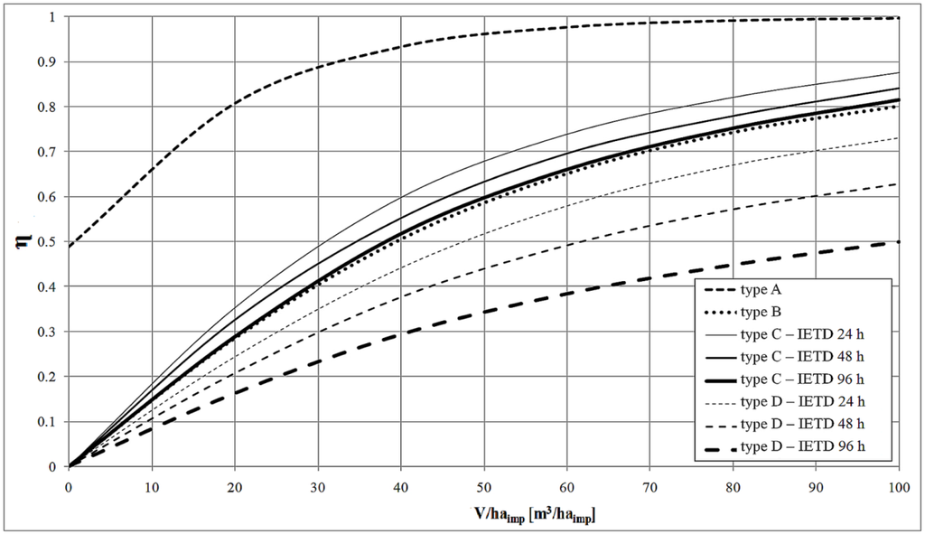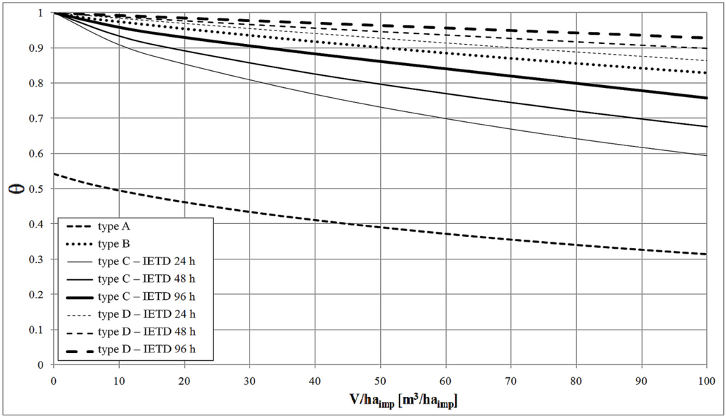 Figure 3 presents the trend of the efficiency index θ for the four different types of capture tank considered. The three IETD values for types C and D were fixed, equal to 24, 48, and 96 h, similar to the values considered by other authors [