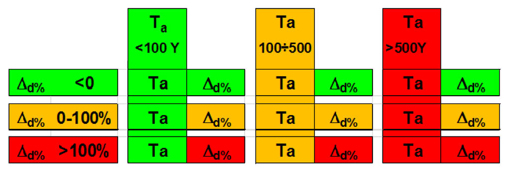 Using this double criterion, the combinations of possibilities are illustrated in Figure 1; here, the most dangerous condition is represented by both Ta and Δd colored in red. This is the case for municipalities where two conditions occur: (1) since the time of the analyzed DHE, the population density has been increasing; (2) during the studied event, the damage was caused by rain having an unexceptional return period, compared to the other value assessed in the surroundings, that most likely will occur again. However, green cells for both Ta and Δd, represent municipalities where two different conditions occur: (1) since the time of the DHE, these areas have been depopulating; and (2) the rain that triggered the damage in the studied event can be considered extremely rare with a very low probability of occurrence. All of the other cases represent intermediate situations, having one factor more dangerous than the other; these factors can either be combined to obtain a score summarizing the situation or can be analyzed separately to correctly address countermeasures. For example, where the more dangerous condition is the increasing urbanization, after a local analysis of places that were historically damaged, it is possible to introduce limitations on the creation of new settlements in the most dangerous areas. However, for locations in which the most dangerous condition depends on the rain, it should be more effective to rely on non-structural measures and take into account the possible worsening of the rain regimen because of climate changes.