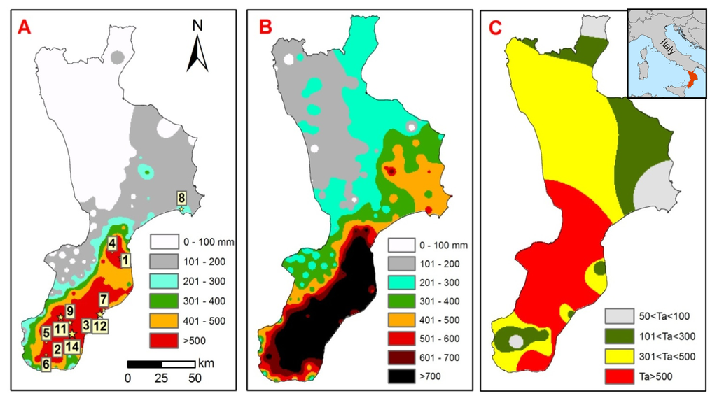 (A) The classification of Calabria according to the accumulated rain of October 16–19, 1951 (mm); (B) The accumulated rain recorded in the region during October 1951 (mm); (C) The regional classification according to the return period of the rain (average value Ta) and the location of the study area.