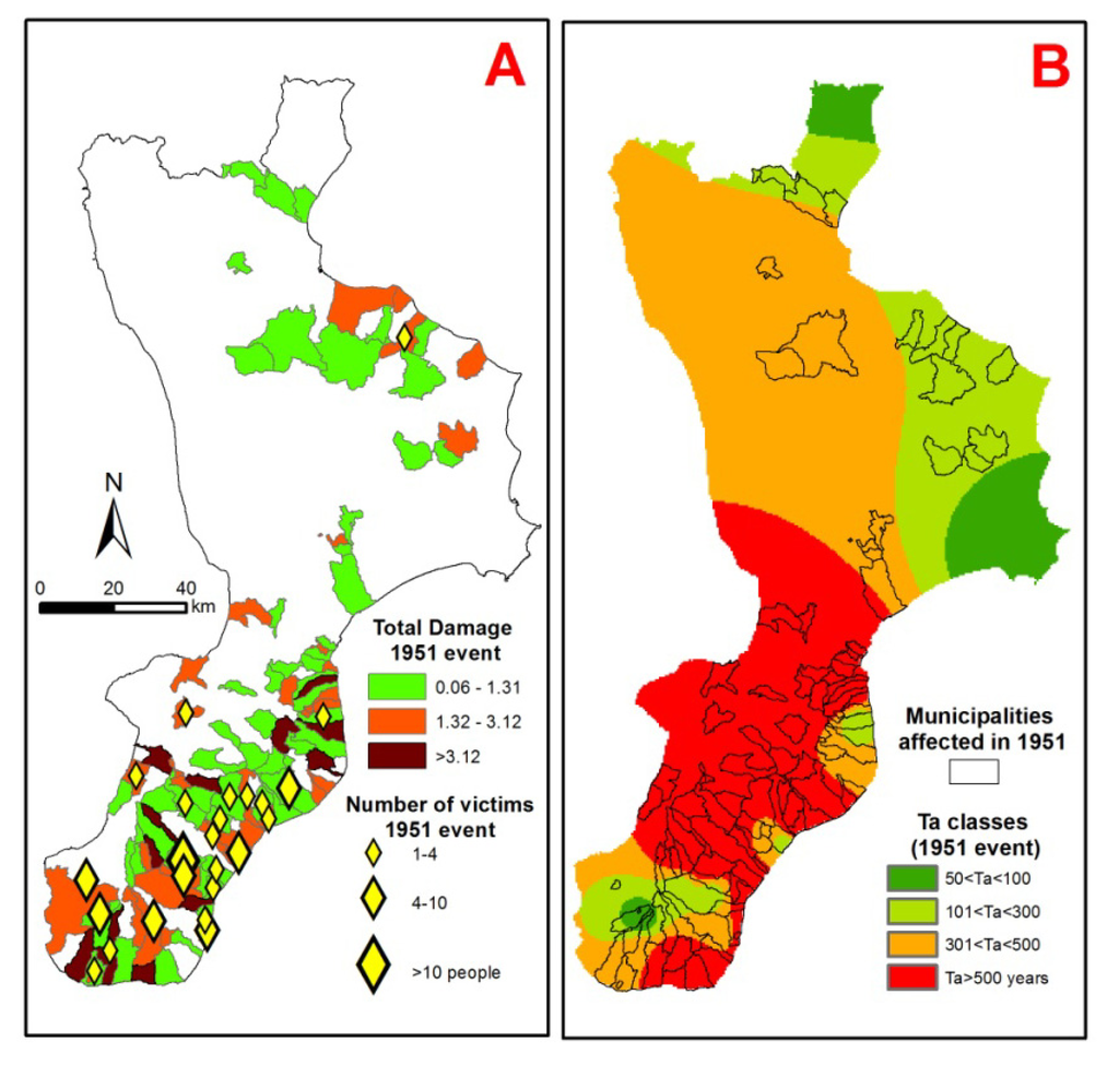 The paper presents the analysis of major DHEs that occurred in 1951 in a region of southern Italy, both in terms of the triggering rainfall and the resulting damage (Figure 4). The probability that a similar event will happen again in the future is assessed using the return period of the triggering rainfall, whereas the different anthropogenic factors are taken into account by means of the population density at the time of the historical event and currently. The result is a classification of regional municipalities according to the probability that events such as the one analyzed will occur again in the future and the possible effects of such an event in the current situation. The usefulness of these results depends on the fact that the phenomena causing damage during these events are generally analyzed separately, instead of all together as they actually occur.