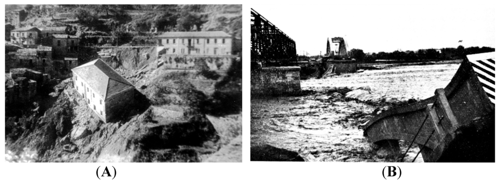 Damage caused by the analyzed DHE. (A) The city-hall of Grotteria village (Reggio C.), moved from the top of a hill because of a landslide (photo from the newspaper L’Unità); (B) The broken bridge on the Careri river, in Reggio Calabria province (after Gulli, []).