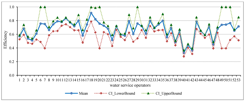 Figure 1 shows a graphical illustration of the average bias-corrected estimates of BCC DEA efficiencies with their 95%-confidence intervals that were obtained generating 2000 bootstrap samples. The bootstrapped mean efficiency score was used as the dependent variable in the Tobit regression.