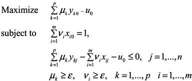 In this formulation, it is assumed that there exist n water service providers to be evaluated. Each provider consumes varying amounts of m different inputs in order to produce p different outputs. In particular, the provider “j” consumes amounts xij of inputs (xij with i = 1,…, m), and produces amounts ykj of outputs (ykj with k = 1,…, p). x0 ≡ (x10,…, xm0) and y0 ≡ (y10,…, yp0) indicate amounts of inputs and outputs of the provider “0” that is under evaluation. X and Y respectively denote the m × n input and the p × n output matrices for the n providers. Finally, ԑ is a small positive number and 1 ≡ (1,…, 1) is a unit vector.