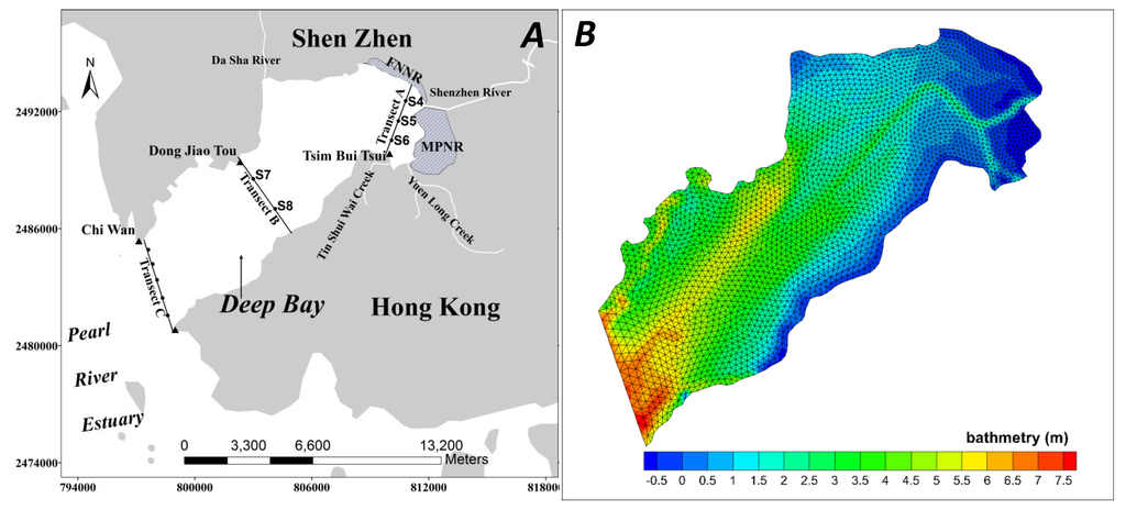 Deep Bay (22.41° to 22.53° N, 113.88° to 114.00° E) is a semi-enclosed shallow bay on the eastern side of the Pearl Estuary, between Shenzhen to the north and the New Territories of Hong Kong to the south (Figure 1A). The width of the bay varies from 4 km to 7.6 km at the narrowest section near the mouth. The length is 13.9 km, and the total sea surface area is about 80 km2. It is influenced by the irregular mixed semi-diurnal tide of the South China Sea. Four major rivers (Shenzhen, Dasha, Yuen Long and Tin Shui Wai River) discharge into the bay with relatively small flow rates. Because of its unique geographic location, the embayment exhibits complicated tidal and sediment movement, subjected to tidal flushing and river outflows, as well as human activities, like reclamation []. Deep Bay is important for the conservation of the Futian National Nature Reserve (FNNR) and the Mai Po Nature Reserve (MPNR). These wetlands are located near the mouth of Shenzhen River at the upstream of Deep Bay and provide a habitat for numerous rare and endangered species []. The wetlands have been suffering from increasing contamination problems in the region, for example, the adsorption and release of heavy metals and organic pollutants from sediments in the water and sea bottom [].