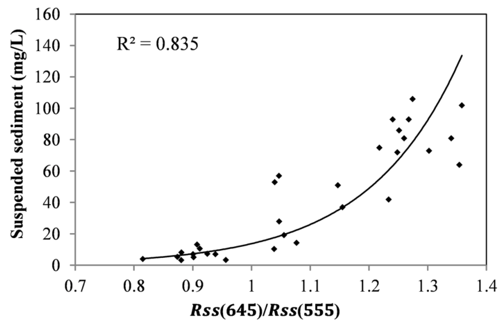 Using satellite image data to derive sea surface sediment concentration, a relationship between suspended sediment concentration (SSC) and water reflectance must be determined. Such relationships have been proposed through semi-analytical algorithms based on radiative transfer theory [,] and, very often, by empirical regression methods. Many empirical regression relationships documented by other researchers have been tested to establish the remote sensing retrieval models of the suspended sediment. These empirical models include linear, exponential, logarithmic statistical relationships, and so forth [,,]. In this study, we tried to establish an empirical regression algorithm for retrieving the sediment concentration from MODIS images.
