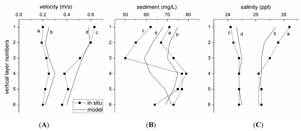 Figure 4 compares the profiles of measured and modeled current velocity, sediment concentration and salinity at the maximum flood (11:00, on 17 October) and the maximum ebb (4:00, on 18 October) periods. The comparisons show that the simulated results can reasonably represent the profiles denoted by the measurements. It can be seen that the vertical velocities at the maximum ebb period are relatively higher than the ones at the maximum flood period, but the vertical sediment concentrations are higher at the maximum flood period. This is probably because tidal transport dominates the sediment dynamic at the maximum flood period, when a large amount of sediments are carried into the bay from the outer bay. It should be noted that, at the maximum ebb period, the high concentrations occurred at the near-bottom layers, which may be caused by the bottom resuspension, because the tidal flow reached the maximum current velocity. The vertical profiles of salinity demonstrate unobvious vertical stratification. It can be seen that the salinities shown in the profile at the maximum flood period are relatively higher than those at the maximum ebb period. This is because the tidal level at the maximum flood period (0.95 m) is higher than that at the maximum ebb period (0.64 m), so more salt water is brought into the bay at the maximum flood period.