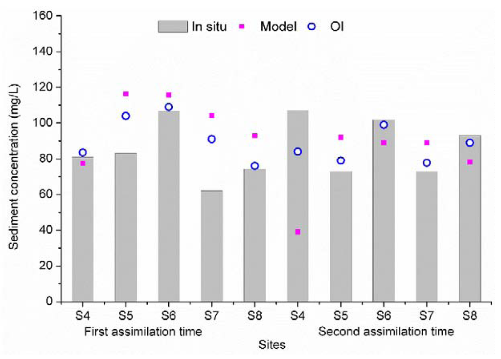 Figure 5 shows the comparison of sediment concentration from in situ, model and OI results at the two assimilation times. It shows that the model overestimated the surface sediment concentration at most of the sites, and they are clearly improved by OI. The improvement is also pronounced for the underestimated sediment concentration at sites S4, S6 and S8 at the second assimilation time. For all validation sites, the relative errors of the model vary from 4.3% to 68.1%, and for OI, results vary from 0.8% to 31.9%. The OI results reduce the errors by 36%–91%.