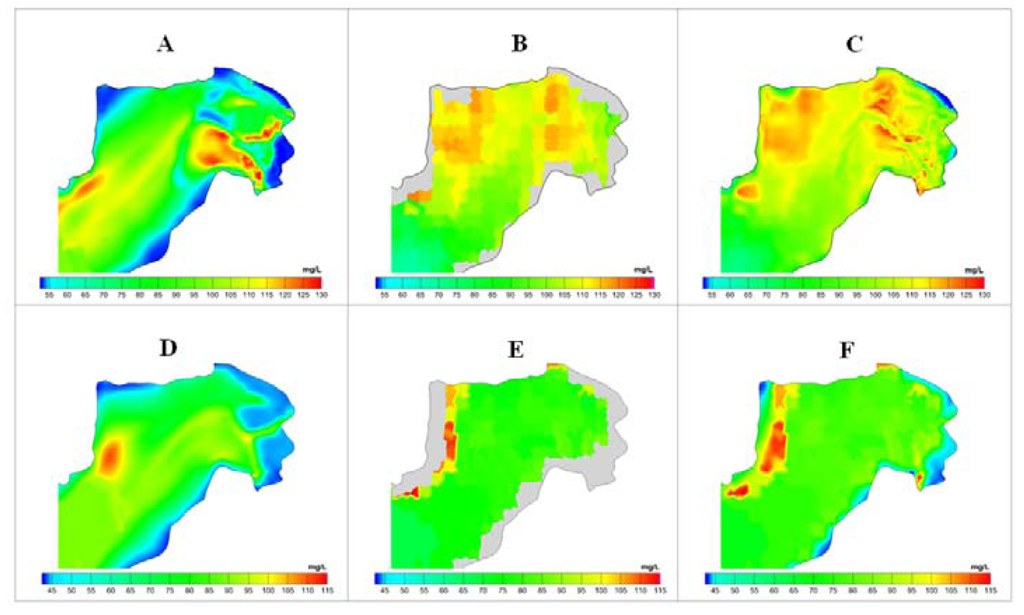 Comparison of the sediment spatial distribution from those retrieved from (A) model results (Model); (B) remote sensing images (RS); and (C) OI results at the first assimilation time (13:30, on 17 October) and from (D) model results (Model); (E) remote sensing images (RS); and (F) OI results at the second assimilation time (13:30, on 18 October).