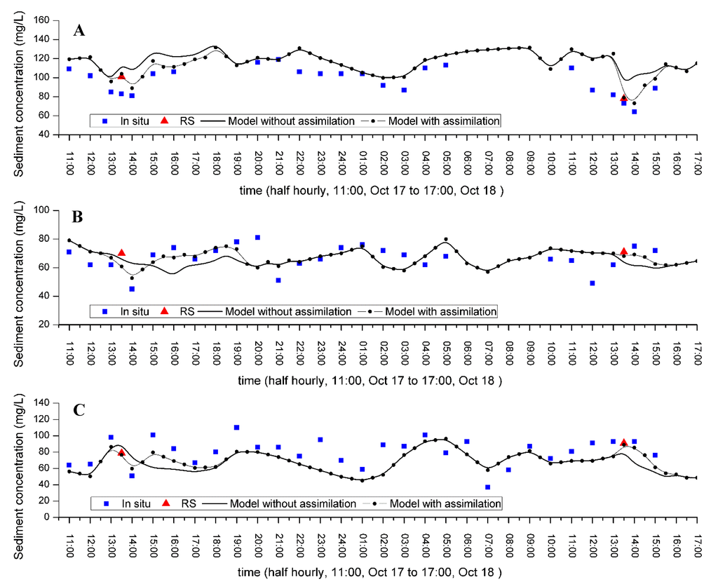 The time series of in situ measured surface sediment (half hourly) and forecasted sediment from the model with and without assimilation (half hourly) at sites S5 (A); S7 (B); and S8 (C). The remote sensing sediment at the assimilation time is also shown.