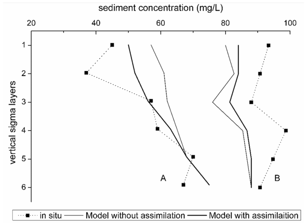 The temporal ability produced by assimilating the surface sediment concentration is not limited to the upper surface layer. As an integral part of the sediment distribution in the water column, the surface sediment is involved in sediment settling and vertical mixing in the sediment transport model. Therefore, updating the surface sediment concentration by assimilation has the potential to change the sediment movement trend, hence affecting all of the simulated sediment vertical profiles. In this study, such a temporal ability in the vertical column has been observed. However, the temporal effect of data assimilation still did not remain too long in the water column and, at most, lasted for one hour. In consideration of the small effect caused by a very small amount of discharged sediment from the rivers (see Table 1), this may be owed to the rapid sediment exchange between the sea bed and the water column. However, from the RMSE statistics of simulated depth-averaged sediment concentration in the limit effect time, it can be seen that the model with data assimilation reduced the RMSE of the simulated depth-averaged sediment concentration by 36% against the model without data assimilation. This reveals the potential ability of surface sediment data assimilation to improve three-dimensional sediment concentration forecasting. Figure 8 demonstrates the comparison of the vertical sediment profile from measurements, the model with and that without data assimilation at S7 half an hour after the first assimilation time and the second assimilation time. A positive change of sediment distribution from the model with data assimilation can be seen in the figure. Effective schemes on how to improve the sediment modeling in the lower layer within a longer forecast time by assimilating surface sediment should be further explored.