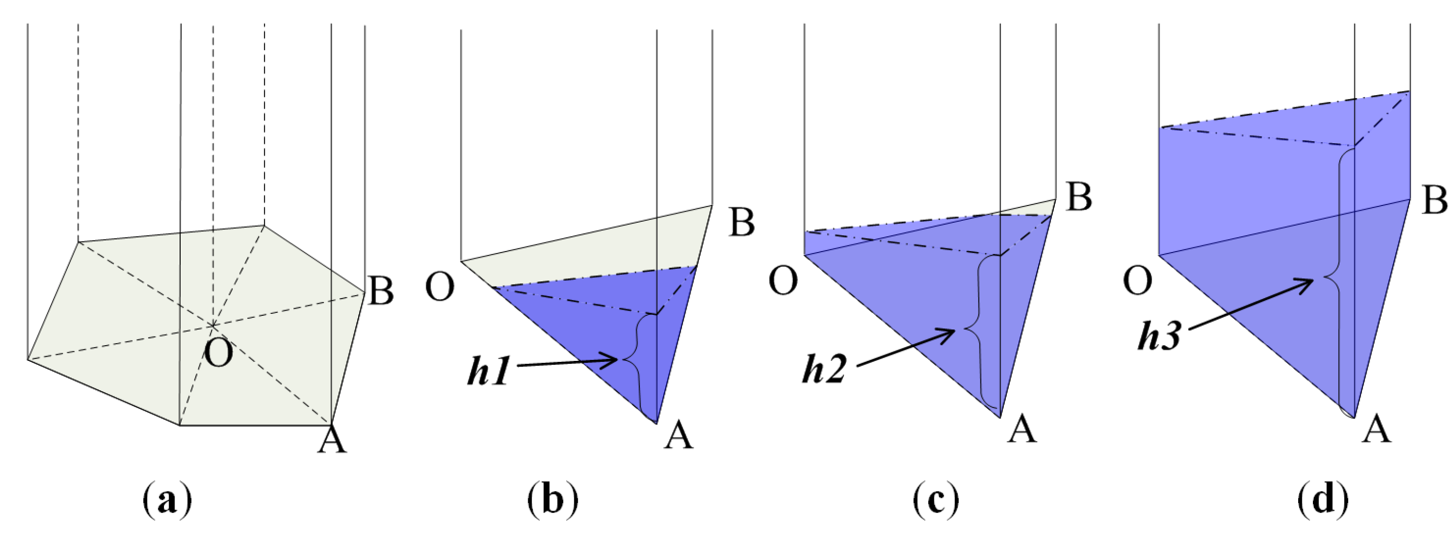 - Within each basin which consist of triangular-prism sets, calculate the water volume Q0, Q1 under the inundation depth of H0 and H1;